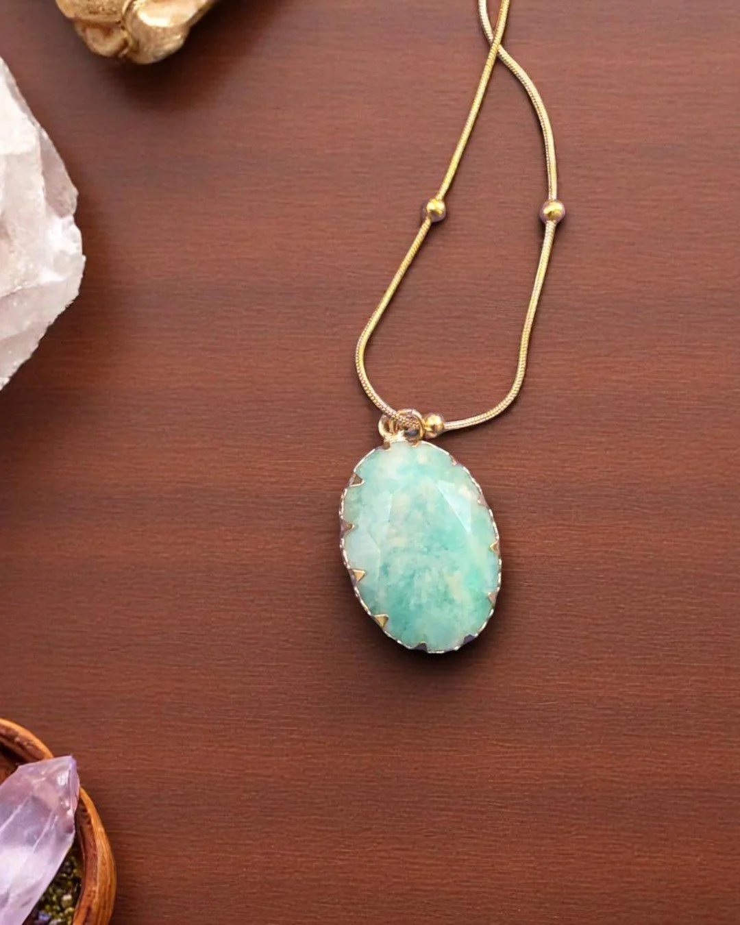 Crafted from high-quality amazonite stone, known for its rich shades of green and blue, this necklace serves not only as a beautiful accessory but also as a source of soothing properties. The pendant, expertly polished to showcase the stone's natural patterns, is suspended from a delicate chain that complements its earthy tones. Whether worn for a special occasion or as an everyday statement piece, the Amazonite Pendant Necklace brings a sense of tranquility and balance to the wearer, making it a meaningful addition to any jewelry collection.